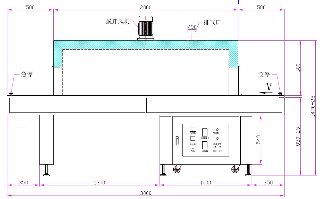 1. 采用不锈钢发热管(单根功率650W、220V) | 2. 发热管安装在工件上方 |