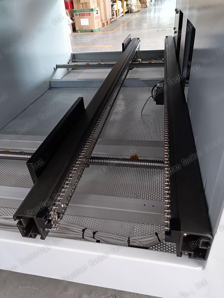 产品通道,出口安装光感应开关 | 输送材料:上层08BS单倍速链输送,下层35B不锈钢长销链条(销长5mm) |