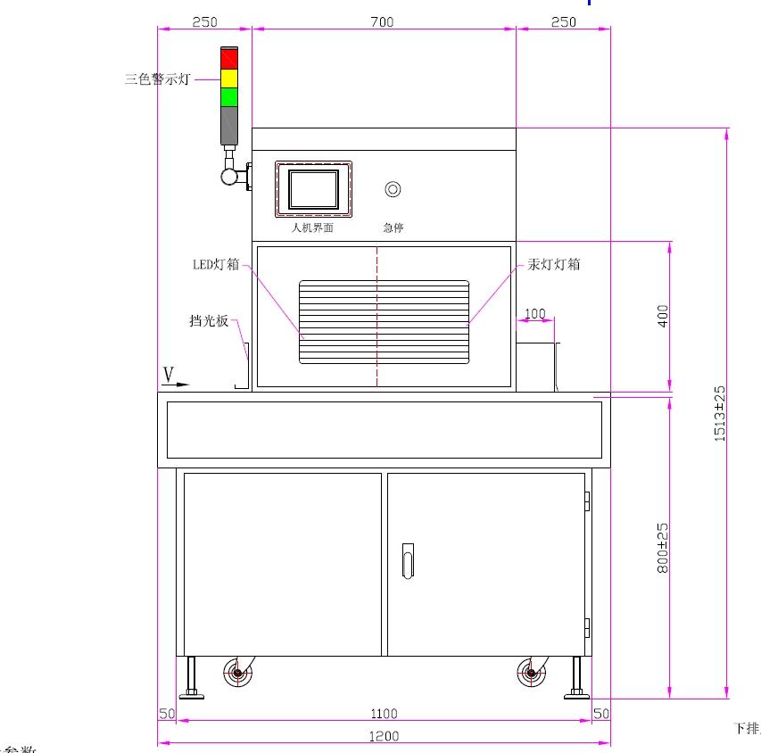 1、LED光源:LED灯1组、UV汞灯4kw1组 2、UV汞灯总长:370mm、弧长:270mm | 3、UV波段主波峰:LED/385+395nm、汞灯365nm |