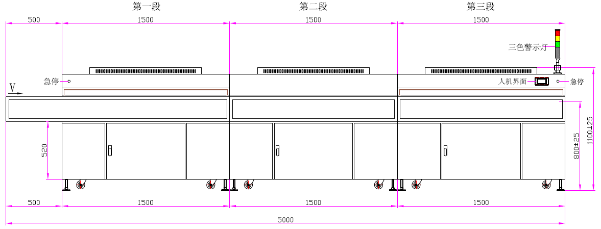 9、输送速度:0~5m/min(每段速度单独控制) | 10、入口高度:35mm |