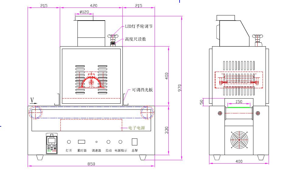 5.UV灯散热采用风冷系统 6.UV灯组高低手轮调节