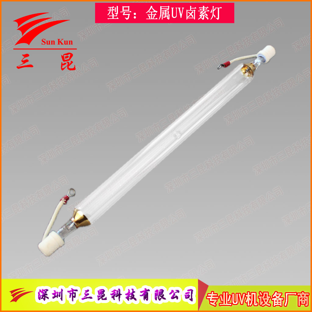 UV卤素灯比常规工业的生产固化通常使用高压UV汞灯,由于高压汞灯是由单纯汞被激,发出不连续特征光谱,是不“丰富”的,在某些固化得不到理想的效率,在灯腔内加入相应的卤化金属,如溴化铁,加强和丰富灯的有效紫外线,用作各类紫外线光敏油墨、紫外线光敏漆、紫外线光敏胶的固化。